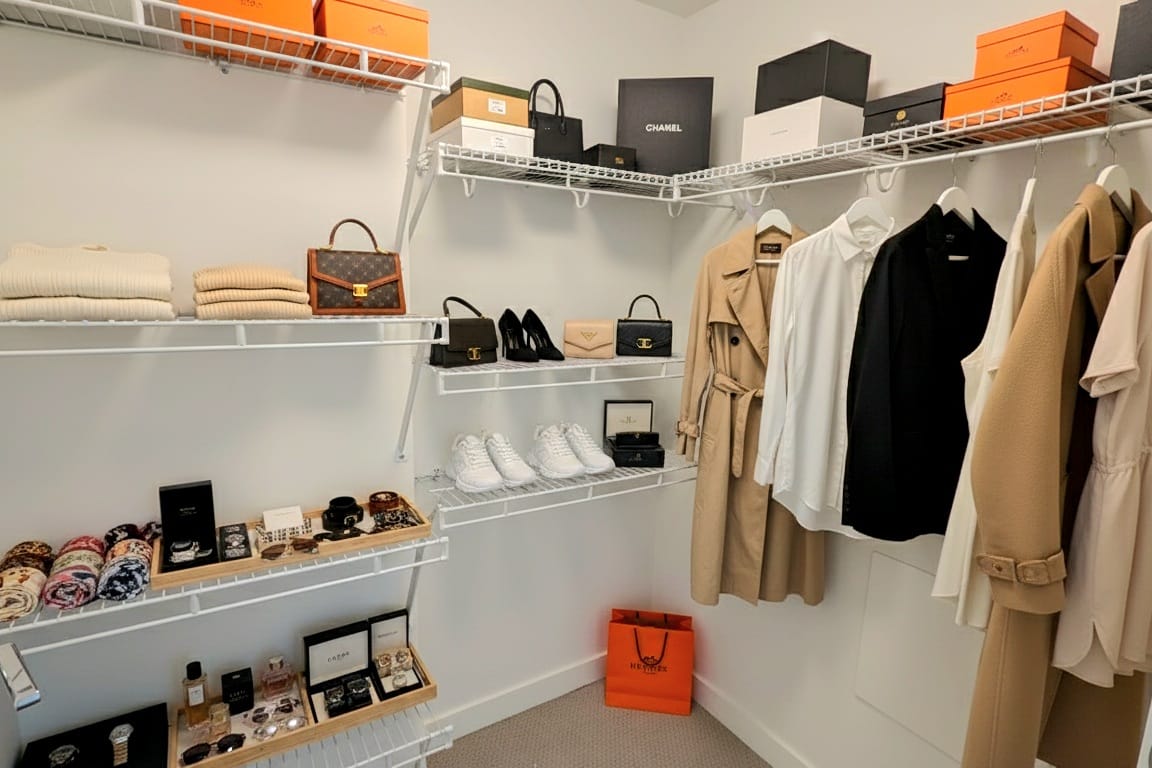 Private master bedroom featuring generous closet space and a spa-inspired ensuite with modern fixtures, full-size vanity, and a frameless glass shower.