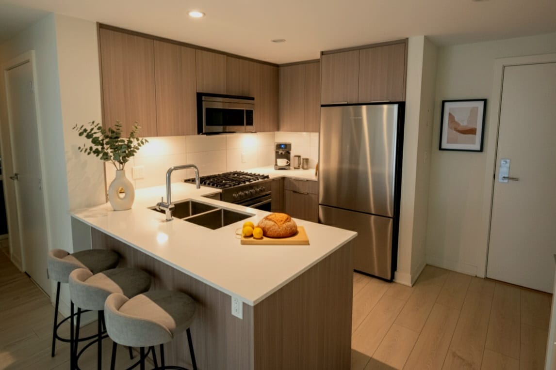 Open-concept kitchen with contemporary flat-panel cabinetry, quartz countertops, and integrated stainless steel appliances. Ideal for both everyday use and entertaining, it flows seamlessly into the dining and living areas.