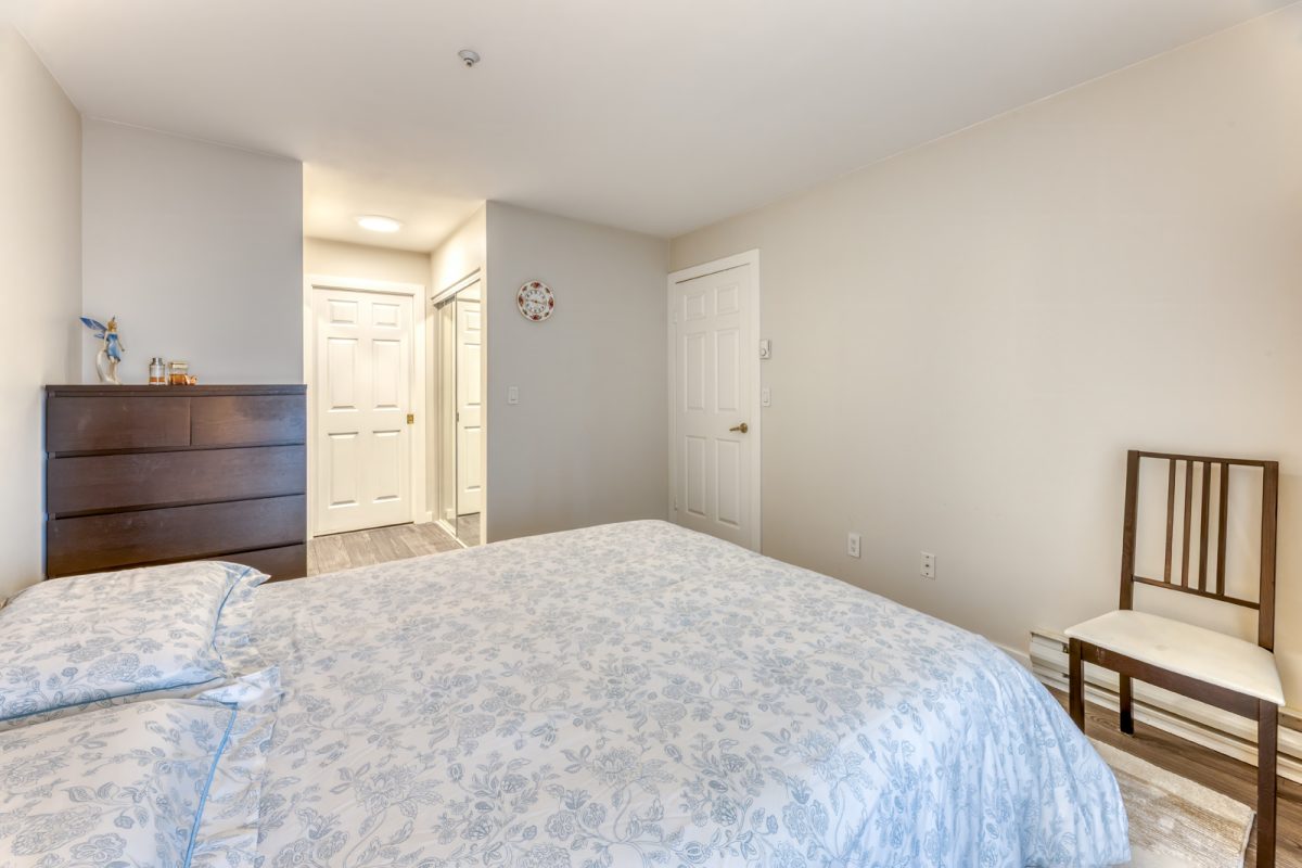 Primary bedroom with generous closet space and balcony access. Second bedroom ideal for guests or a home office.
