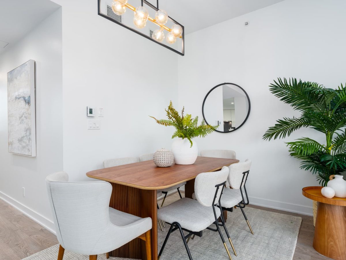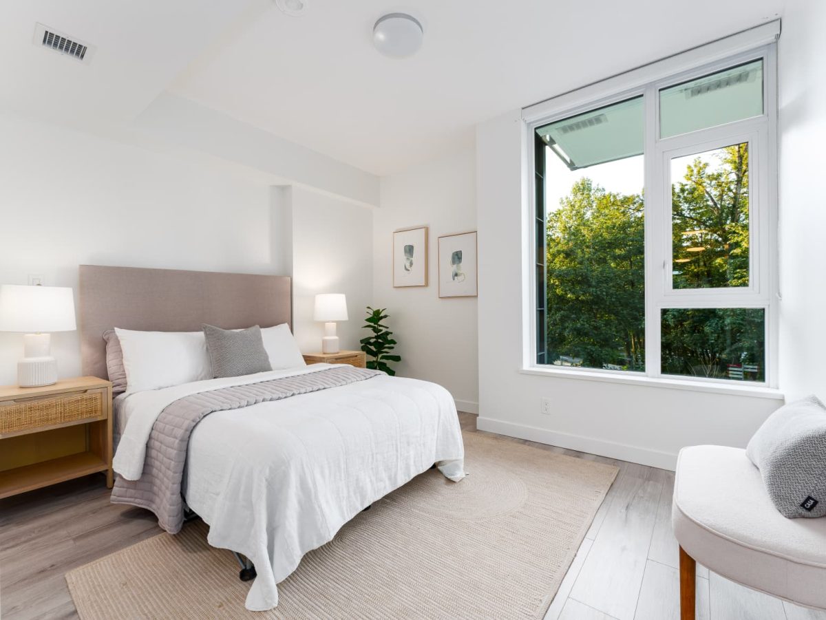 The bright and spacious living room opens to the private patio/deck, blending indoor and outdoor living effortlessly. With wide-plank flooring, generous windows, and an open layout, this space is perfect for relaxing, entertaining guests, and enjoying day-to-day life in style.